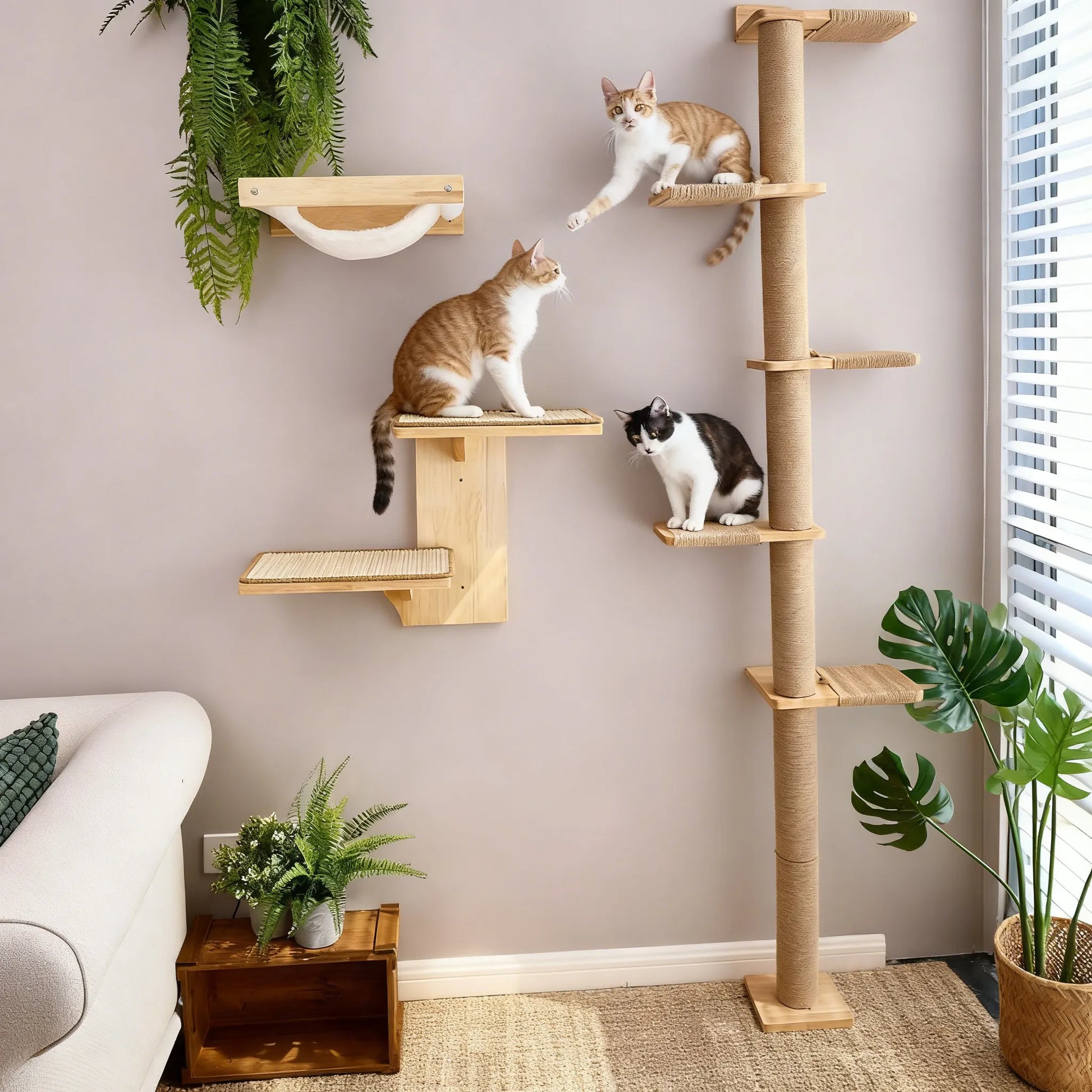 【Space-Saving Solution】The wall jungle series offers cats their own area without occupying human living space. The floor-to-ceiling cat tree base measures only 7.5" x 6.5", fitting even small rooms.