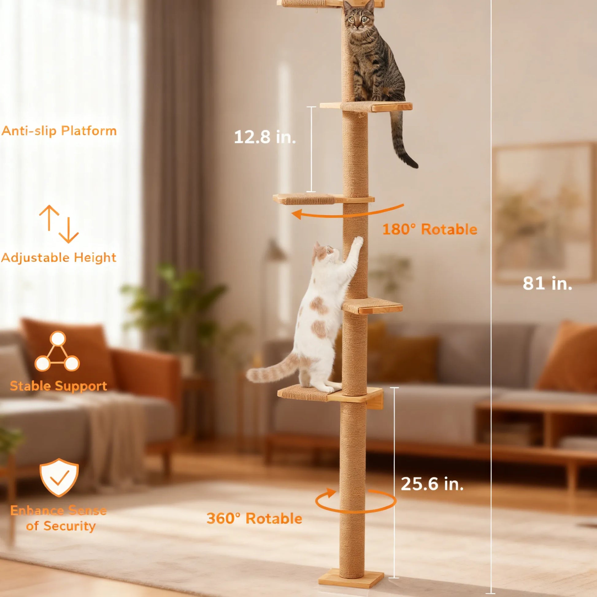 Tall Cat Tree, 5-Tier Floor-to-Ceiling Tower, Wall-Mounted Scratching Post & Wild Shelves, Perfect for Climbing & Play